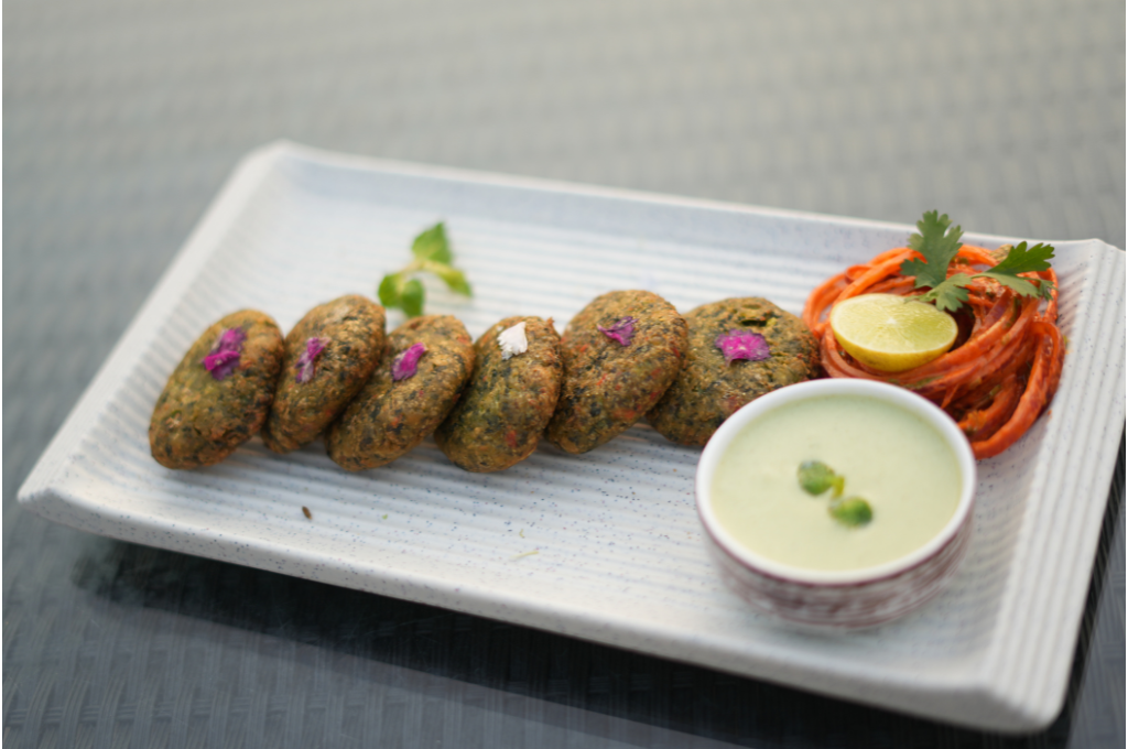 Char-grilled paneer infused with basil and olives, offering a Mediterranean touch