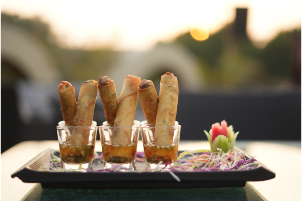 Crispy golden rolls filled with spiced cheese and veggies, served with a zesty dip